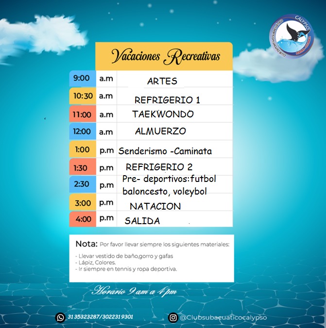 Artes, Futbol, Voleibol, Natación, Taekwondo, Futbol, Polideportivo, son algunas de las actividades que realizamos, en jornadas desde las 9:00am hasta las 4:00pm en donde se incluyen el almuerzo y dos refrigerios.