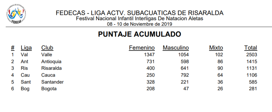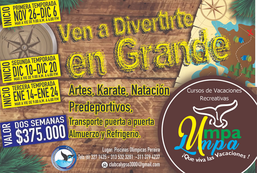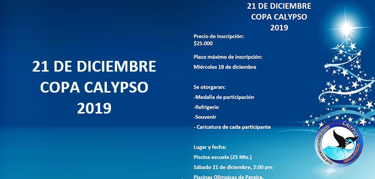 El Club deportivo Subacuático Calypso invita a la Copa CALYPSO 2019 de Navidad de Natación con aletas, que se realizará el día sábado 21 de diciembre desde las 2:00pm, en las Piscinas de la Villa Olímpica de Pereira. Con el objetivo principal de promover la participación y competitividad de la mayor cantidad posible de nadadores y lograr permitir a los deportistas establecer sus marcas y a su vez chequearse. Inscripciones en nuestras oficinas o por nuestro email: clubcalypso3000@gmail.com. El evento contará con jueces federados.